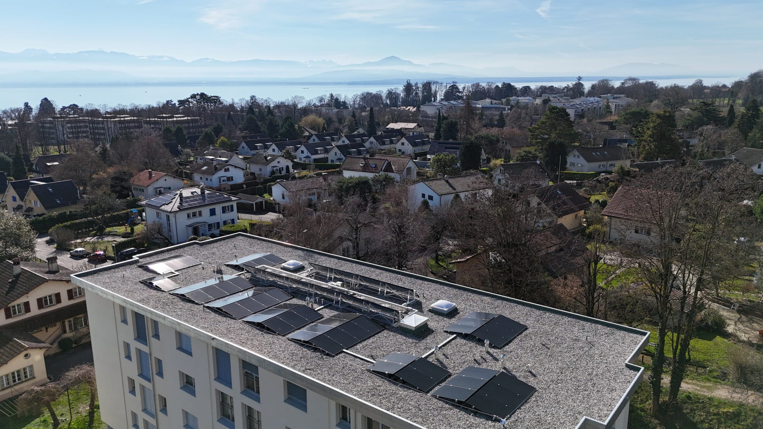 Installation sur toiture plate avec autoconsommation collective pour l’ensemble des appartements.